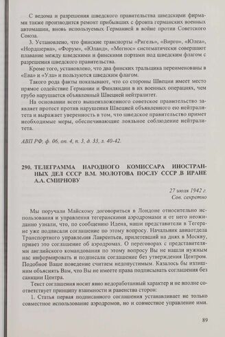 Телеграмма народного комиссара иностранных дел СССР В.М. Молотова послу СССР в Иране А.А. Смирнову. 27 июля 1942 г. // АВП РФ, ф. 059, оп. 1, п. 379, д. 2581, л. 115-116.