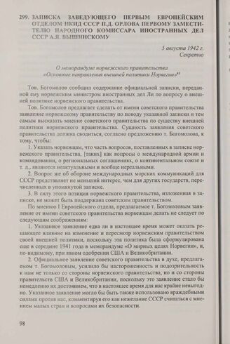Записка заведующего Первым Европейским отделом НКИД СССР П.Д. Орлова первому заместителю народного комиссара иностранных дел СССР А.Я. Вышинскому. 5 августа 1942 г. // АВП РФ, ф. 0116, оп. 24, п. 123а, д. 5, л. 8-9. Опубл.: Советско-норвежские отношения 1917-1955. — М., 1997. — С. 324-326 (далее: Советско-норвежские отношения...).