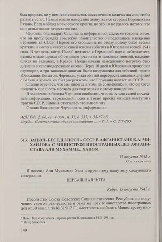 Запись беседы посла СССР в Афганистане К.А. Михайлова с министром иностранных дел Афганистана Али Мухаммед Ханом. 15 августа 1942 г. // АВП РФ, ф. 06, оп. 4, п. 16, д. 165, л. 36-39.