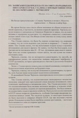 Запись беседы председателя Совета народных комиссаров СССР И.В. Сталина с премьер-министром Великобритании У. Черчиллем. Москва, ночь с 15 на 16 августа 1942 г. // АВП РФ, ф. 06, оп. 4 доп., п. 31, д. 335, л. 38-40 об. Опубл.: СССР и германский вопрос ... — Т. 1. — С. 165-167.
