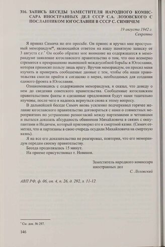 Запись беседы заместителя народного комиссара иностранных дел СССР С.А. Лозовского с посланником Югославии в СССР С. Симичем. 19 августа 1942 г. // АВП РФ, ф. 06, оп. 4, п. 26, д. 292, л. 11-12.