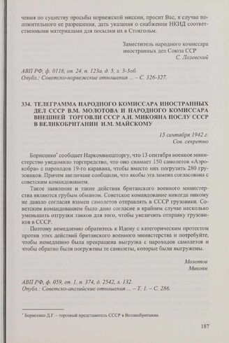 Телеграмма народного комиссара иностранных дел СССР В.М. Молотова и народного комиссара внешней торговли СССР А.И. Микояна послу СССР в Великобритании И.М. Майскому. 15 сентября 1942 г. // АВП РФ, ф. 059, оп. 1, п. 374, д. 2542, л. 132. Опубл.: Советско-английские отношения ... — Т. 1. — С. 286.