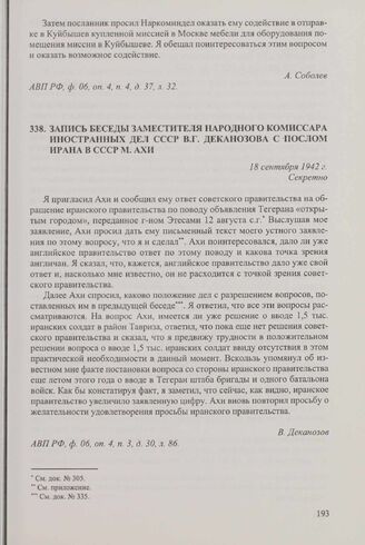 Запись беседы заместителя народного комиссара иностранных дел СССР В.Г. Деканозова с послом Ирана в СССР М. Ахи. 18 сентября 1942 г. // АВП РФ, ф. 06, оп. 4, п. 3, д. 30, л. 86.