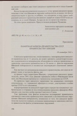 Приложение к записи беседы заместителя народного комиссара иностранных дел СССР С.А. Лозовского с посланником Швеции в СССР В. Ассарссоном от 19 сентября 1942 г. Памятная записка правительства СССР правительству Швеции. 19 сентября 1942 г. // АВПРФ, ф. 06, оп. 4, п. 3, д. 34, л. 70-73.