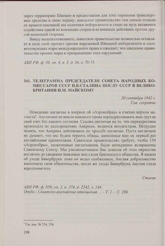Телеграмма председателя Совета народных комиссаров СССР И.В. Сталина послу СССР в Великобритании И.М. Майскому. 20 сентября 1942 г.