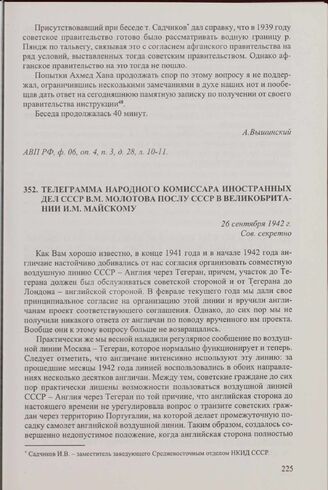 Телеграмма народного комиссара иностранных дел СССР В.М. Молотова послу СССР в Великобритании И.М. Майскому. 26 сентября 1942 г. // АВП РФ, ф. 059, оп. 1, п. 374, д. 2542, л. 159-160.