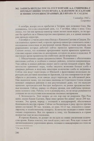 Запись беседы посла СССР в Иране А.А. Смирнова с премьер-министром Ирана А. Кавамом эс-Салтане и министром иностранных дел Ирана М. Саедом. 5 октября 1942 г. // АВП РФ, ф. 094, оп. 28, п. 334, д. 10, л. 141-143.
