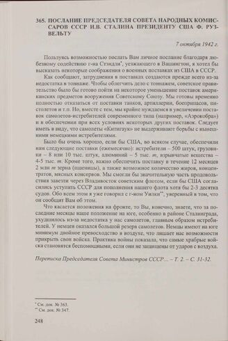 Послание председателя Совета народных комиссаров СССР И.В. Сталина президенту США Ф. Рузвельту. 7 октября 1942 г. // Переписка Председателя Совета Министров СССР... — Т. 2. — С. 31-32.