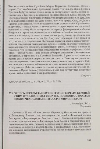 Запись беседы заведующего Четвертым Европейским отделом НКИД СССР Н.В. Новикова с посланником Чехословакии в СССР З. Фирлингером. 14 октября 1942 г. // АВП РФ, ф. 06, оп. 4, п. 25, д. 277, л. 104-105.