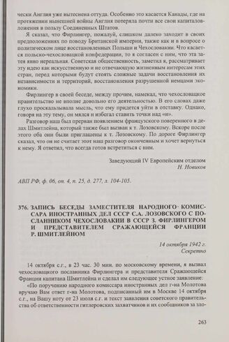 Запись беседы заместителя народного комиссара иностранных дел СССР С.А. Лозовского с посланником Чехословакии в СССР З. Фирлингером и представителем Сражающейся Франции Р. Шмитлейном. 14 октября 1942 г. // АВП РФ, ф. 06, оп. 4, п. 4, д. 35, л. 42-43.