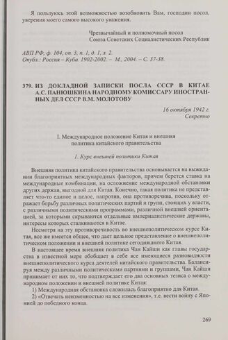 Из докладной записки посла СССР в Китае А.С. Панюшкина народному комиссару иностранных дел СССР В.М. Молотову. 16 октября 1942 г. // АВП РФ, ф. 06, оп. 4, п. 19, д. 194, л. 62-180.