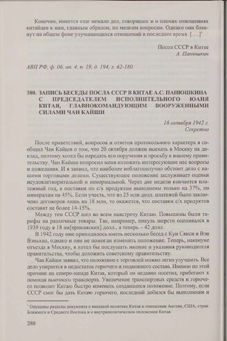 Запись беседы посла СССР в Китае А.С. Панюшкина с председателем Исполнительного юаня Китая, главнокомандующим Вооруженными силами Чан Кайши. 16 октября 1942 г. // АВП РФ, ф. 0100, оп. 29, п. 205, д. 11, л. 325-328 .