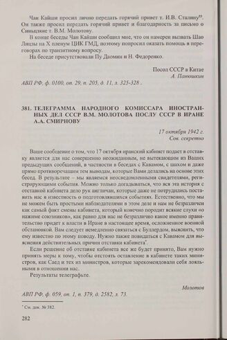 Телеграмма народного комиссара иностранных дел СССР В.М. Молотова послу СССР в Иране А.А. Смирнову. 17 октября 1942 г. // АВП РФ, ф. 059, оп. 1, п. 379, д. 2582, л. 73.