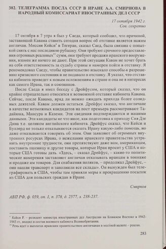 Телеграмма посла СССР в Иране А.А. Смирнова в Народный комиссариат иностранных дел СССР. 17 октября 1942 г. [1] // АВП РФ, ф. 059, оп. 1, п. 378, д. 2577, л. 238-237.