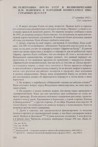Телеграмма посла СССР в Великобритании И.М. Майского в Народный комиссариат иностранных дел СССР. 27 октября 1942 г. // АВП РФ, ф. 059, оп. 8, п. 2, д. 7, л. 372-369.