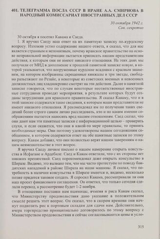Телеграмма посла СССР в Иране А.А. Смирнова в Народный комиссариат иностранных дел СССР. 30 октября 1942 г. // АВП РФ, ф. 059, оп. 1, п. 378, д. 2587, л. 43-41.