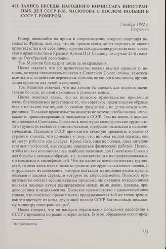 Запись беседы народного комиссара иностранных дел СССР В.М. Молотова с послом Польши в СССР Т. Ромером. 3 ноября 1942 г.