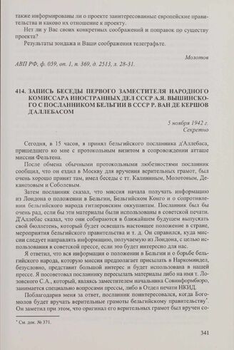 Запись беседы первого заместителя народного комиссара иностранных дел СССР А.Я. Вышинского с посланником Бельгии в СССР Р. Ван де Кершов д'Аллебасом. 5 ноября 1942 г.