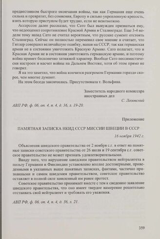 Приложение к записи беседы заместителя народного комиссара иностранных дел СССР С.А. Лозовского с посланником Швеции в СССР В. Ассарссоном от 16 ноября 1942 г. Памятная записка НКИД СССР миссии Швеции в СССР. 16 ноября 1942 г.