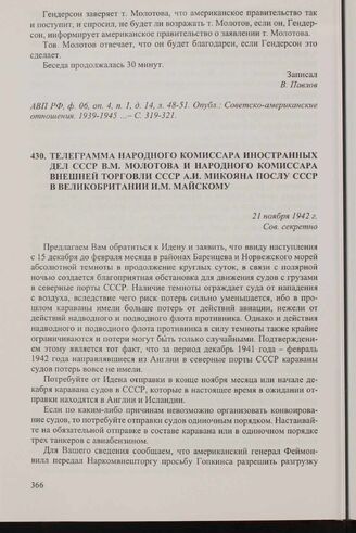 Телеграмма народного комиссара иностранных дел СССР В.М. Молотова и народного комиссара внешней торговли СССР А.И. Микояна послу СССР в Великобритании И.М. Майскому. 21 ноября 1942 г. // АВП РФ, ф. 059, оп. 1, п. 374, д. 2543, л. 134. Опубл.: Советско-английские отношения... — Т. 1. — С. 310-311.
