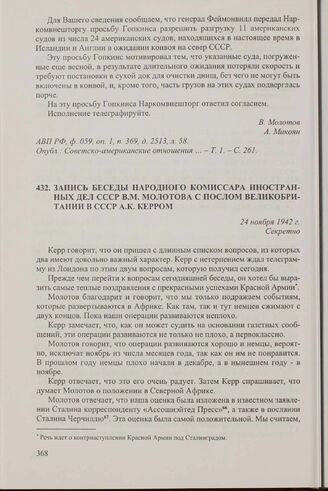 Запись беседы народного комиссара иностранных дел СССР В.М. Молотова с послом Великобритании в СССР А.К. Керром. 24 ноября 1942 г. // АВП РФ, ф. 06, оп. 4, п. 1, д. 14, л. 53-64. Опубл.: СССР и германский вопрос ... — Т. 1. — С. 176-186.