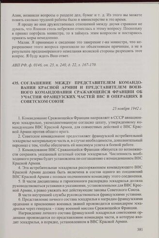 Соглашение между представителем командования Красной Армии и представителем военного командования Сражающейся Франции об участии французских частей ВВС в операциях в Советском Союзе. 25 ноября 1942 г.
