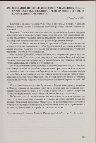 Послание председателя Совета народных комиссаров СССР И.В. Сталина премьер-министру Великобритании У. Черчиллю. 27 ноября 1942 г. // Переписка Председателя Совета Министров СССР ... — Т. 1. — С. 97-98.