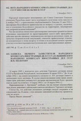 Записка первого заместителя народного комиссара иностранных дел СССР А.Я. Вышинского народному комиссару иностранных дел СССР В.М. Молотову. 3 декабря 1942 г. // АВП РФ, ф. 0100, оп. 29, п. 207, д. 33, л. 6.