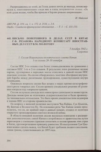 Письмо поверенного в делах СССР в Китае Г.Ф. Резанова народному комиссару иностранных дел СССР В.М. Молотову. 5 декабря 1942 г. // АВП РФ, ф. 06, оп. 4, п. 19, д. 195, л. 1-3.