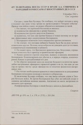 Телеграмма посла СССР в Иране А.А. Смирнова в Народный комиссариат иностранных дел СССР. 9 декабря 1942 г. [3] // АВП РФ, ф. 059, оп. 1, п. 378, д. 2578, л. 285-284.