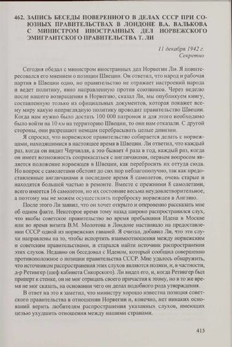Запись беседы поверенного в делах СССР при союзных правительствах в Лондоне В.А. Валькова с министром иностранных дел норвежского эмигрантского правительства Т. Ли. 11 декабря 1942 г.