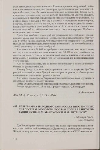 Телеграмма народного комиссара иностранных дел СССР В.М. Молотова послам СССР в Великобритании и США И.М. Майскому и М.М. Литвинову. 15 декабря 1942 г. // АВП РФ, ф. 059, оп. 1, п. 383, д. 2607, л. 300-301.