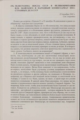 Телеграмма посла СССР в Великобритании И.М. Майского в Народный комиссариат иностранных дел СССР. 23 декабря 1942 г. // АВП РФ, ф. 059, оп. 1, п. 372, д. 2534, л. 189-184.