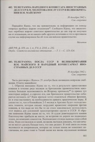 Главная Документы внешней политики СССР Документы внешней политики СССР. Т. XXV. 2 января-30 декабря 1942 г... Телеграмма посла СССР в Великобритании И.М. Майского в Народный ком...