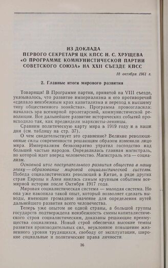 Из доклада первого секретаря ЦК КПСС Н.С. Хрущева «о программе коммунистической партии Советского Союза» на XXII съезде КПСС. 18 октября 1961 г. // Печат. по кн.: «Материалы XXII съезда КПСС». М., 1961. стр. 128-135. 198-210.