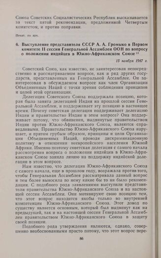 Выступление представителя СССР А.А. Громыко в Первом комитете II сессии Генеральной Ассамблеи ООН по вопросу о положении индийцев в Южно-Африканском Союзе. 15 ноября 1947 г. // Печат. по арх. Опубл. в книге «Делегации СССР, УССР и БССР на второй сессии Генеральной Ассамблеи Организации Объединенных Наций». М., 1948, стр. 486-496.