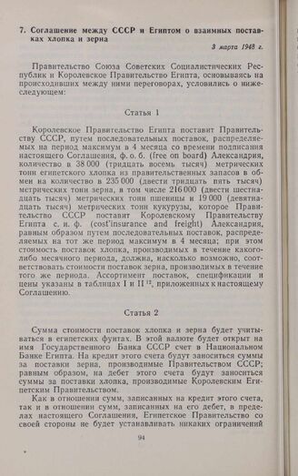 Соглашение между СССР и Египтом о взаимных поставках хлопка и зерна. 3 марта 1948 г.