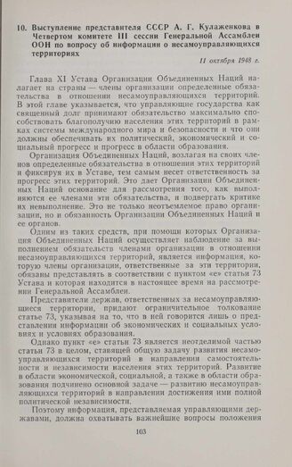 Выступление представителя СССР А.Г. Кулаженкова в Четвертом комитете III сессии Генеральной Ассамблеи ООН по вопросу об информации о несамоуправляющихся территориях. 11 октября 1948 г. // Печат. по арх. Опубл. в изложении в газ. «Правда», № 290 (11031), 16 октября 1948 г.