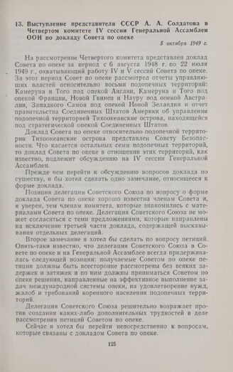 Выступление представителя СССР А.А. Солдатова в Четвертом комитете IV сессии Генеральной Ассамблеи ООН по докладу Совета по опеке. 5 октября 1949 г. // Печат. по арх.