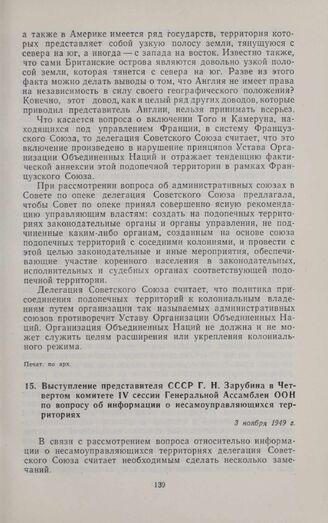 Выступление представителя СССР Г.Н. Зарубина в Четвертом комитете IV сессии Генеральной Ассамблеи ООН по вопросу об информации о несамоуправляющихся территориях. 3 ноября 1949 г. // Печат. по арх.