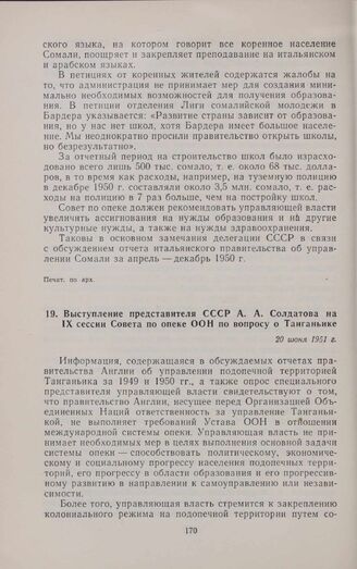Выступление представителя СССР А.А. Солдатова на IX сессии Совета по опеке ООН по вопросу о Танганьике. 20 июня 1951 г. // Печат. по арх.