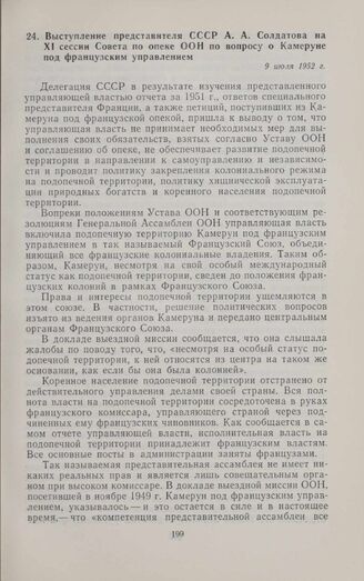 Выступление представителя СССР А.А. Солдатова на XI сессии Совета по опеке ООН по вопросу о Камеруне под французским управлением. 9 июля 1952 г. // Печат. по арх.
