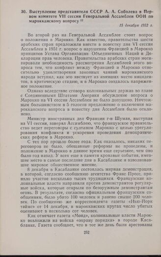 Выступление представителя СССР А.А. Соболева в Первом комитете VII сессии Генеральной Ассамблеи ООН по марокканскому вопросу. 15 декабря 1952 г. // Печат. по арх.