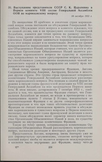 Выступление представителя СССР С.К. Царапкина в Первом комитете VIII сессии Генеральной Ассамблеи ООН по марокканскому вопросу. 14 октября 1953 г. // Печат. по арх.