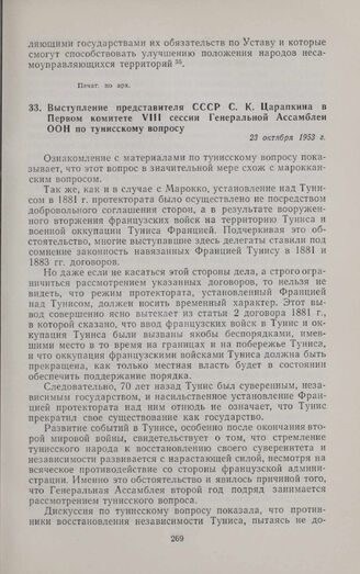 Выступление представителя СССР С.К. Царапкина в Первом комитете VIII сессии Генеральной Ассамблеи ООН по тунисскому вопросу. 23 октября 1953 г. // Печат. по арх.