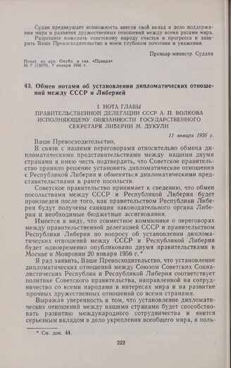 Обмен нотами об установлении дипломатических отношений между СССР и Либерией. I. Нота главы правительственной делегации СССР А.П. Волкова исполняющему обязанности государственного секретаря Либерии М. Дукули. 11 января 1956 г.