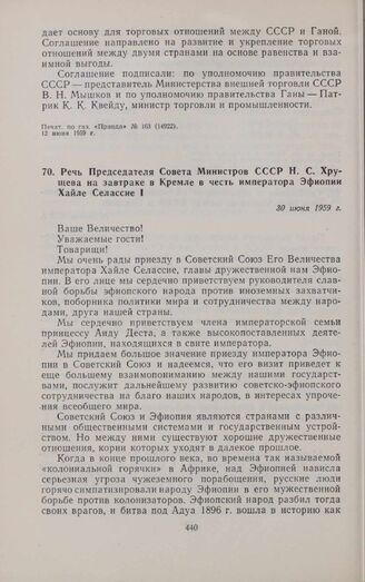 Речь Председателя Совета Министров СССР Н.С. Хрущева на завтраке в Кремле в честь императора Эфиопии Хайле Селассие I. 30 июня 1959 г. // Печат. по кн. Н.С. Хрущев, Мир без оружия — мир без войн, т. 1, М., 1960, стр. 414-416.