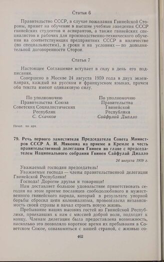 Речь первого заместителя Председателя Совета Министров СССР А.И. Микояна на приеме в Кремле в честь правительственной делегации Гвинеи во главе с председателем Национального собрания Гвинеи Сайфулай Диалло. 24 августа 1959 г. // Печат. по газ. «Правда», № 237 (14996), 25 августа 1959 г.