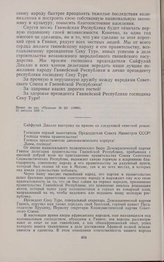Главная СССР и страны Африки СССР и страны Африки. 1946-1962 гг. В 2 т. Т. 1. (1946 г.-сентябрь ... Документы Ответная речь председателя Национального собрания Гвинеи Сайфулай Д...