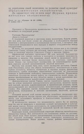 Речь Президента и Председателя правительства Гвинеи Секу Туре на митинге дружбы между народами СССР и Гвинеи. 26 ноября 1959 г. // Печат. по газ. «Правда», № 331 (15090), 27 ноября 1959 г.
